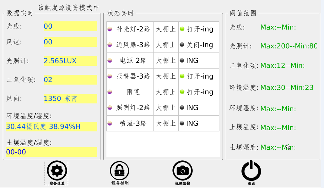 具有傳感器與執(zhí)行器的聯(lián)動設(shè)置功能。設(shè)置傳感器的上、下限值,以及當(dāng)傳感器采樣低至下限或高至上限時,執(zhí)行器的動作,可實現(xiàn):(1)大棚內(nèi)溫度自動調(diào)節(jié)功能,(2)大棚濕度自動調(diào)節(jié)功能,(3)土壤濕度自動調(diào)節(jié)功能,(4)光照強度自動調(diào)節(jié),(5)大棚CO2濃度自動調(diào)節(jié)等功能。
