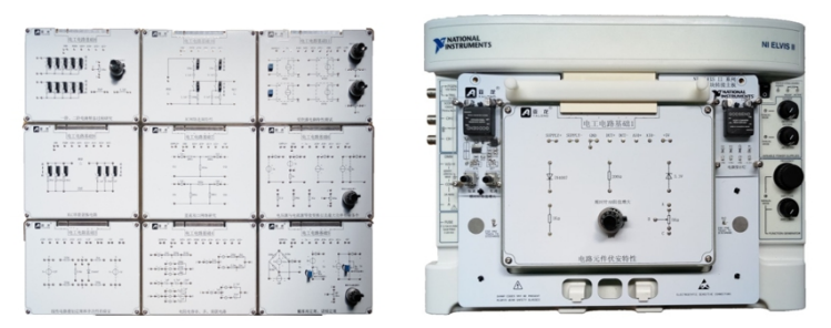 本設備是將電工電路實際應用中單元電路模塊化。通過與NI ELVIS 結合使用,電路功能測試是通過NI ELVIS 平臺專用的轉接口進行連接,不在需要其他外部電源信號進行連接,并且電路的測量是通過NI ELVIS 平臺集成了12款常用虛擬儀器進行測量其功能參數(shù),可通過USB接口與PC連接,實現(xiàn)快速易用的測量采集及顯示,并能在統(tǒng)一平臺上實現(xiàn)多用戶多應用,因此降低了成本。NI ELVIS可實現(xiàn)各類應用,從而幫助各學科中不同學習進度的學生。從電路基礎學習到進行研究工作,都可在同一平臺上實現(xiàn)。便于教師的教學和學生的認識,所有實訓的內(nèi)容均由學生通過電子連接線搭接,培養(yǎng)學生的動手能力以及解決問題的能力。