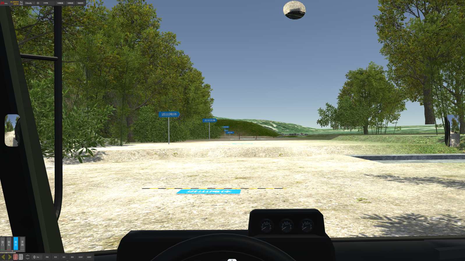 2、軟件主界面:啟動畫面后,界面下方同時顯示:油門、剎車、轉向、離合器深淺進度均有顯示。視景120度全新廣角寬頻駕駛模擬,界面顯示各項指示燈、文字提示框、檔位位置、訓練成績,后視鏡(左、右、中)后視鏡可調節(jié)、訓練線路圖均有顯示。