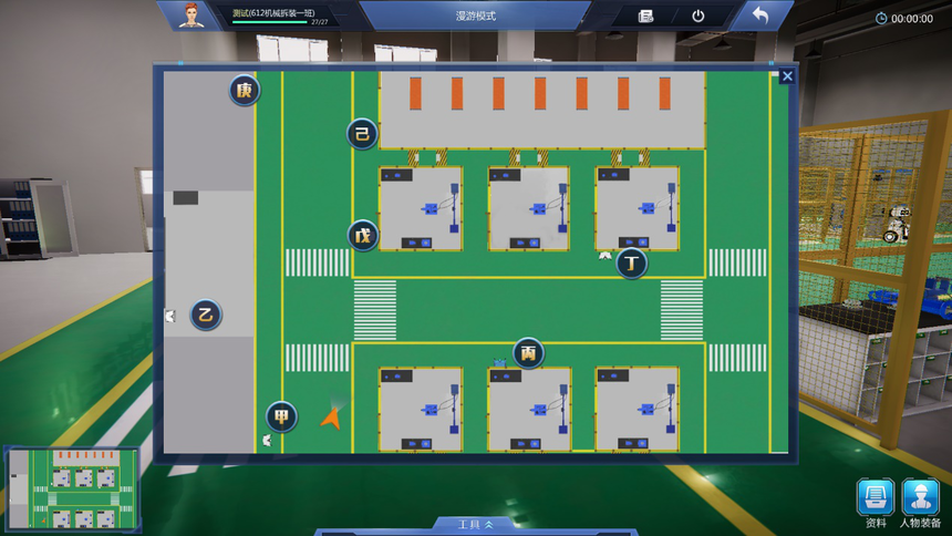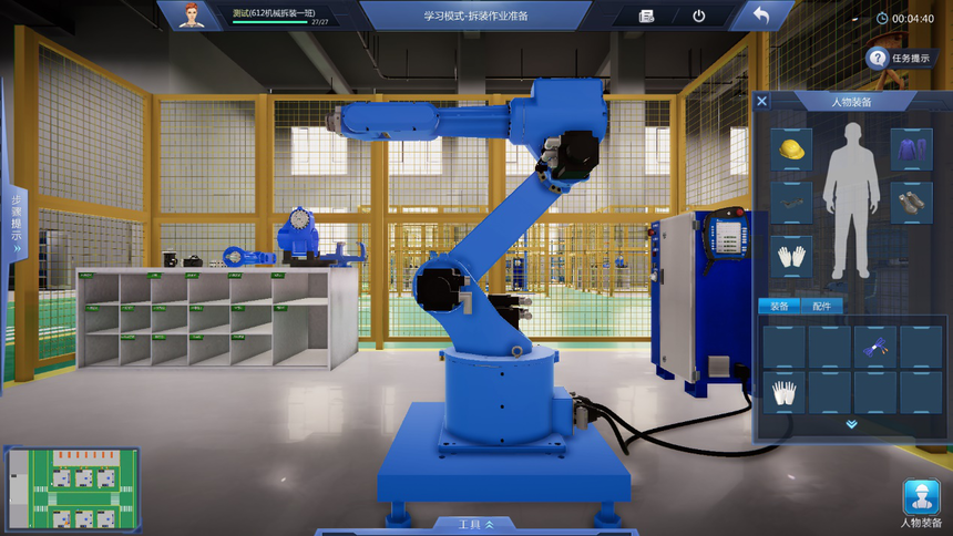 9、友好操作體驗設計:設置專用工具欄,可以通過工具欄中的快捷鍵快速選擇工具,提高實訓系統(tǒng)使用效率,同時加深對工具的認識。地圖及快速跳轉、箭頭指示多形式導航,通過小地圖實現(xiàn)快速跳轉到機器人NPC獲得指引。地標指引箭頭,有效提示下一任務的操作位置。