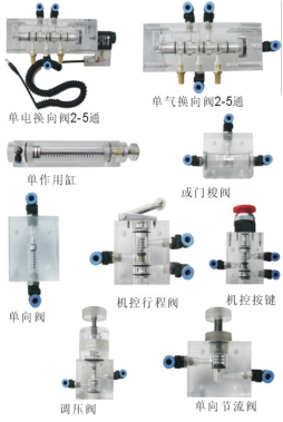 3、透明氣動與PLC實訓(xùn)裝置各個透明氣動元件成獨立模塊,且裝有帶彈性卡扣底板,可方便、隨意地將元件安放在實訓(xùn)面板(面板帶“T”溝槽形式的鋁合金型材結(jié)構(gòu))上?;芈反罱硬捎每鞊Q接頭,布局靈活,拆接方便快捷。