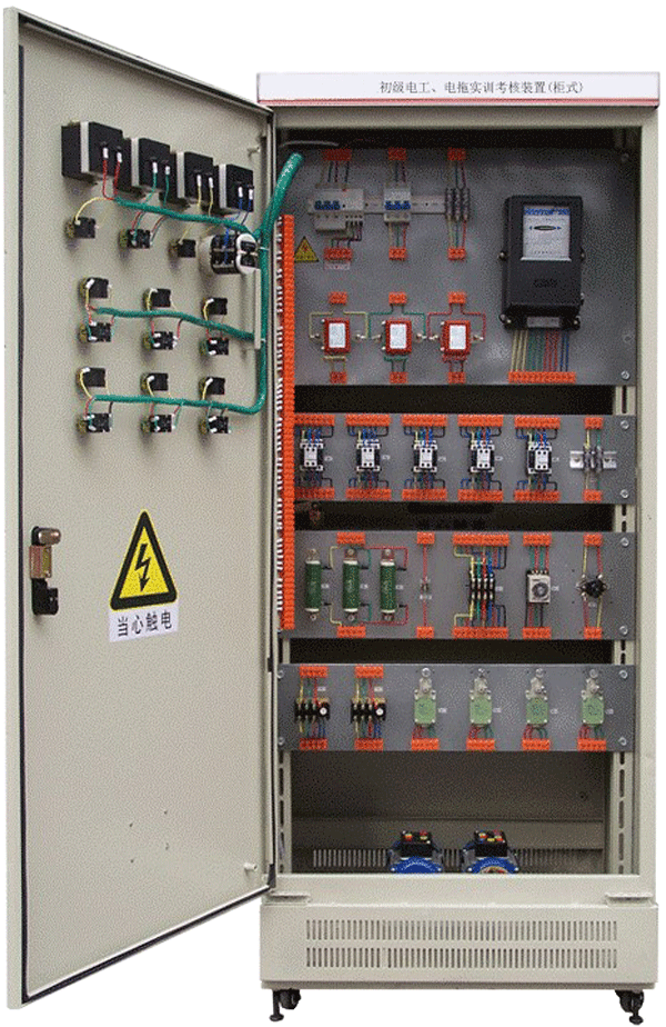 電工電拖實訓考核裝置是按照勞動社會保障部頒發(fā)的“工人技術(shù)等級標準”和“職業(yè)技能鑒定規(guī)范”的內(nèi)容要求,根據(jù)初級電工培訓考核的實際情況而設計的新一代集培訓學習、理論驗證、實際操作能力、考核鑒定于一體的多功能柜式設備。整臺設備以標準的電氣控制柜為主柜,利用柜體的雙面空間,布置電器及配套實驗器材,能完成初級電工考核鑒定中的電力拖動控制與照明電路的實操項目,該電工、電拖實訓考核裝置堅持理論聯(lián)系實際的原則,突出技能訓練,注重針對性、實用性、科學性,經(jīng)全國多家職業(yè)技能訓練中心、職校、技校使用證明,該柜體設計合理、實操方便,占地面積少。為延長電器的使用壽命,各電器的接點都與接線端子相連,再讓學生在接線端子上接線,連接電機、電器來完成各項控制實驗,有效降低材料消耗,延長使用壽命。該套設備適用于各勞動職業(yè)技能鑒定部門,同時適應各大、中專、技校、職校電工、電拖專業(yè)教學與實訓考核。