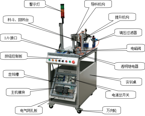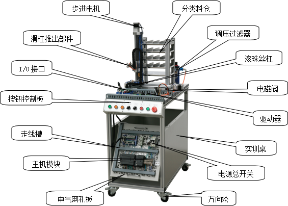 由滾珠絲杠、滑桿推出部件、分類料倉、步進(jìn)電機(jī)、步進(jìn)驅(qū)動(dòng)器、電感傳感器、開關(guān)電源、可編程序控制器、按鈕、I/O接口板、通訊接口板、電氣網(wǎng)孔板、多種類型電磁閥及氣缸組成,主要完成按工件類型分類,將工件推入料倉。