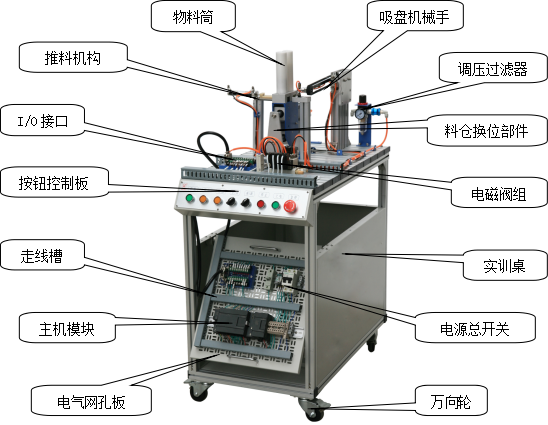 該系統(tǒng)上使用了大量的氣動(dòng)元件,包括多種電控氣動(dòng)閥、多種氣動(dòng)缸、氣動(dòng)夾爪、真空吸盤、真空發(fā)生器、過濾減速閥等。在學(xué)習(xí)這些氣動(dòng)元件時(shí),不但可以單獨(dú)學(xué)習(xí)每一種分離元件,而且還可以在學(xué)習(xí)時(shí)了解各種氣動(dòng)元件之間,以及氣動(dòng)元件與其它元件之間,如何配合起來并協(xié)調(diào)進(jìn)行工作的。