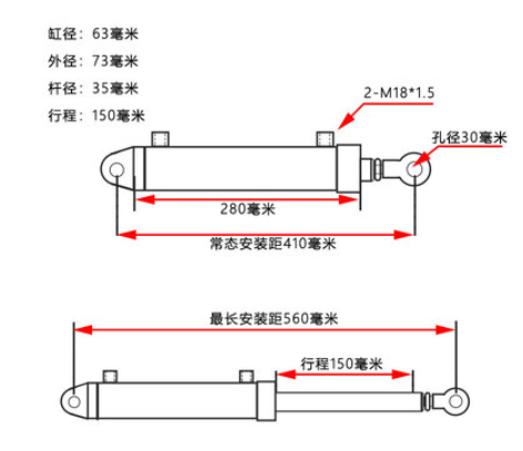 63缸徑雙向雙作用油缸,缸徑63毫米,桿徑35毫米,形成150毫米。