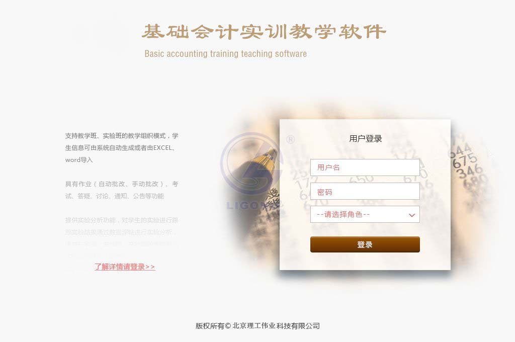 2.教師端模塊:班級(jí)管理、實(shí)驗(yàn)管理、開設(shè)實(shí)驗(yàn)、成績(jī)統(tǒng)計(jì)、實(shí)驗(yàn)分析、課程管理、任務(wù)管理、習(xí)題管理、虛擬企業(yè)、會(huì)計(jì)制度文件、單據(jù)樣式查詢、實(shí)訓(xùn)難度控制、網(wǎng)站薈萃、通知公告、密碼修改。