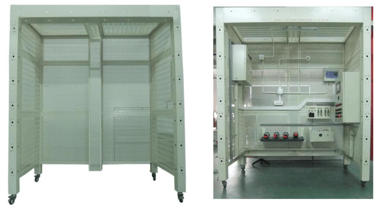 裝置可進(jìn)行電工安裝,如橋架安裝,PVC管安裝,吊燈,白熾燈座,日光燈,開關(guān),插座,控制箱,配電箱等,包含有交流異步電動機(jī),直流電動機(jī),步進(jìn)電機(jī),伺服電機(jī),溫度控制器,電偶,PLC,變頻器觸摸屏等控制與受控對象。每個操作組配套一個移動式工具車和元件柜,便于對原件的保管和安裝施工,從根本上解決了學(xué)校在普通墻面上進(jìn)行安裝培訓(xùn)的使用不方便,實訓(xùn)范圍窄的問題。
