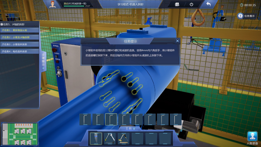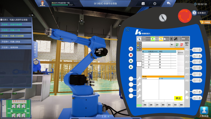 4、學習模式教學實訓任務豐富:機器人拆裝作業(yè)準備虛擬仿真實訓項目包含拆裝作業(yè)防護準備、機器人拆裝工具認知、機器人拆卸作業(yè)準備等至少3個教學實訓任務;機器人本體拆卸虛擬仿真實訓項目包含機器人整體拆卸、機器人J6軸到J1軸的分步拆卸、諧波減速機的認知、RV減速機的認知等至少9個教學實訓任務;機器人本體安裝虛擬仿真實訓項目包含機器人整體安裝、機器人J1軸到J6軸的分步安裝、機器人注油、軸承的認知、軸的初步認知等至少少10個教學實訓任務。機器人初步調試項目包含調試前準備、機器人開機、機器人關機、機器人基礎調試、機器人精度檢測等至少5個教學實訓任務。