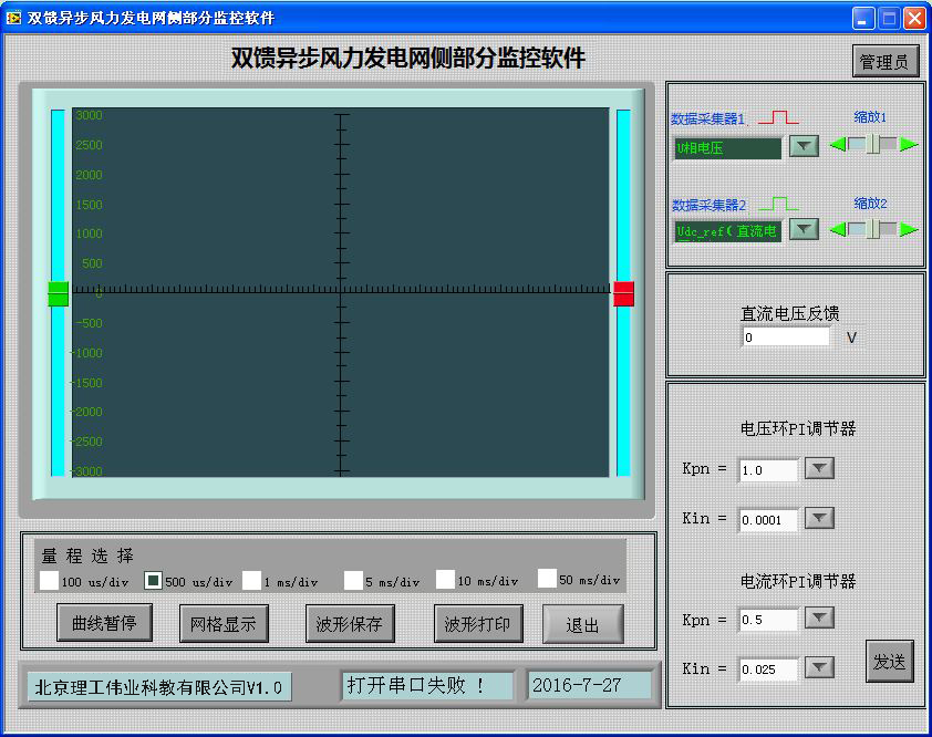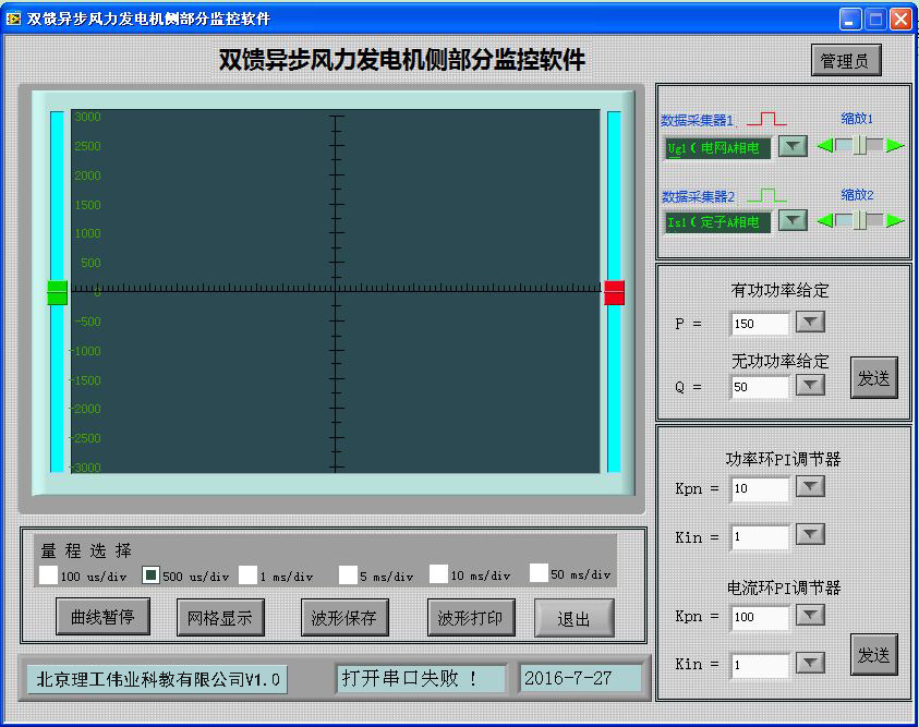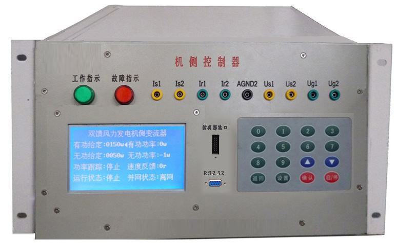 機(jī)側(cè)控制器的作用主要有兩個(gè)方面,一是給雙饋發(fā)電機(jī)的轉(zhuǎn)子提供勵(lì)磁分量的電流,從而可以調(diào)節(jié)雙饋發(fā)電機(jī)的定子側(cè)所發(fā)出的無功功率;二是通過控制雙饋發(fā)電機(jī)轉(zhuǎn)子轉(zhuǎn)矩分量的電流控制發(fā)電機(jī)的轉(zhuǎn)速或控制發(fā)電機(jī)定子側(cè)所發(fā)出的有功功率,從而使發(fā)電機(jī)運(yùn)行在風(fēng)力機(jī)的*佳功率曲線上,實(shí)現(xiàn)*大風(fēng)能追蹤(捕獲)運(yùn)行。機(jī)側(cè)控制器面板安裝有兩個(gè)信號(hào)指示燈,16鍵PVC軟鍵盤,240*128點(diǎn)蘭色液晶屏及9個(gè)波形測試端子。信號(hào)指示燈可對(duì)控制器工作、保護(hù)狀態(tài)分別指示;鍵盤可完成機(jī)側(cè)控制器啟動(dòng)/停止設(shè)置,*大功率啟動(dòng)/停止跟蹤設(shè)置,有功/無功給定,手動(dòng)并網(wǎng)/離網(wǎng);液晶屏可顯示轉(zhuǎn)速反饋值,有功/無功反饋值;波形測試端子可通過示波器觀測發(fā)電機(jī)機(jī)轉(zhuǎn)子、定子相電流波形,可觀測發(fā)電機(jī)定子相電壓、電網(wǎng)相電壓波形。