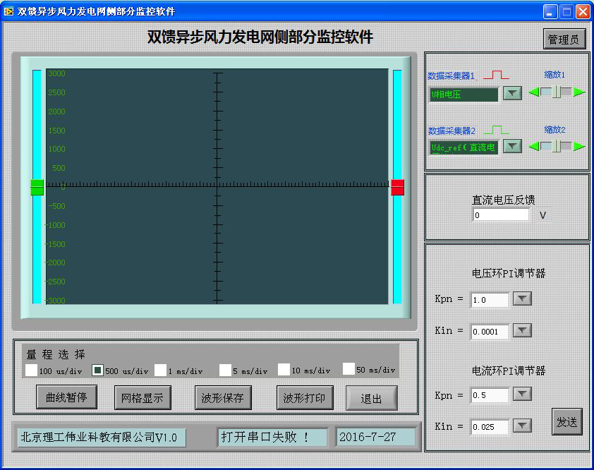 網(wǎng)側(cè)控制器面板安裝有三個(gè)信號(hào)指示燈,16鍵PVC軟鍵盤,240*128點(diǎn)蘭色液晶屏及7個(gè)波形測(cè)試端子。信號(hào)指示燈可對(duì)控制器工作、故障、卸荷狀態(tài)分別給于指示,通過(guò)鍵盤可完成并網(wǎng)啟動(dòng)/停止設(shè)置。液晶屏可完成三相電流,電壓有效值顯示,直流母線電壓顯示;面板觀測(cè)孔可觀測(cè)電網(wǎng)相電流波形、相電壓波形及直流母線電壓波形。