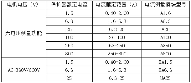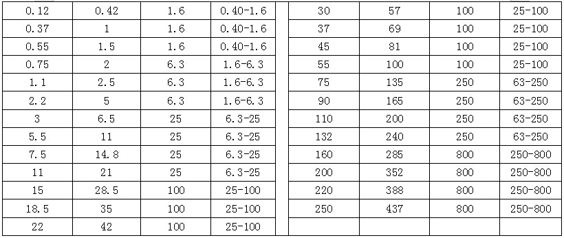 注:>250kW的低壓電動(dòng)機(jī),額定電流小于800A時(shí)均可選用800A等級(jí)的電動(dòng)機(jī)保護(hù)器。