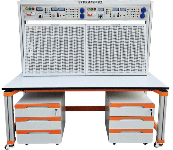 本實訓(xùn)臺由實訓(xùn)屏(內(nèi)置電源)、實訓(xùn)桌、實訓(xùn)儲物柜三大部分組成。