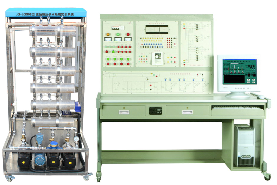 “LG-LGS03型 變頻恒壓供水系統(tǒng)實訓(xùn)裝置”集PLC、變頻調(diào)速、過程控制、工程組態(tài)技術(shù)于一體。它由六層住宅消防、生活供水系統(tǒng)(實物模型),控制平臺兩大部分組成,包含了可編程控制器、變頻器、變頻磁力驅(qū)動泵、休眠泵、消防泵、壓力變送器、壓力儀表、輸水管道、消防栓、家用水龍頭、蓄水池等工程設(shè)備??刂破脚_采用PLC+變頻器的開放式控制結(jié)構(gòu),可以完成多種模式下的樓層恒壓供水實訓(xùn)實訓(xùn),為教學(xué)研究變頻恒壓供水技術(shù)提供一個開放的操作平臺。它是一款適合于大學(xué)及中、高職院校電氣自動化、樓宇自動化、建筑電氣、智能建筑等專業(yè)的綜合型實訓(xùn)設(shè)備。