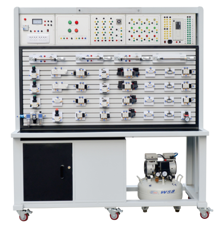 本實(shí)訓(xùn)裝備,由氣動(dòng)元件部分、電氣控制部分及實(shí)訓(xùn)臺(tái)架等組成,電氣部分主要由PLC模塊、繼電器模塊、電源模塊、按鈕模塊等部分組成。實(shí)訓(xùn)臺(tái)主體框架采用鋁木結(jié)構(gòu)組裝完成,臺(tái)架重量較輕且安裝了萬向輪,可方便實(shí)訓(xùn)臺(tái)的移動(dòng)。臺(tái)架分上下兩層結(jié)構(gòu),上面可放置電氣模塊,下面是實(shí)訓(xùn)屏,實(shí)訓(xùn)屏采用帶槽鋁合金結(jié)構(gòu),方便各氣動(dòng)元件的安裝和拆卸,學(xué)生可以根據(jù)實(shí)驗(yàn)需要在實(shí)訓(xùn)屏上任意搭建氣動(dòng)回路,組成具有一定功能的氣動(dòng)系統(tǒng)。實(shí)訓(xùn)臺(tái)采用模塊式結(jié)構(gòu),便于組合與擴(kuò)展,提高了設(shè)備空間的利用率。