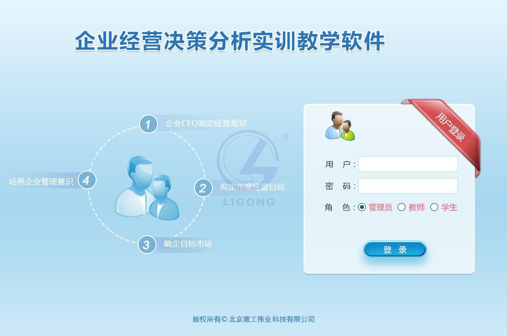 《理工經(jīng)營決策分析實訓軟件》件注重培養(yǎng)和提升學生企業(yè)管理意識,構(gòu)建虛擬的企業(yè)運營環(huán)境,讓學生體驗企業(yè)CEO制定經(jīng)營規(guī)劃、擬定年度經(jīng)營目標、確定目標市場、行業(yè)競爭等工作。