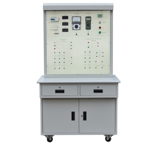 (1)實(shí)訓(xùn)臺(tái)主體部分采用全鋼結(jié)構(gòu),鋼板亞光噴塑,美觀耐用,臺(tái)面采用鋁塑板印制而成,整個(gè)實(shí)訓(xùn)臺(tái)由漏電保護(hù)開關(guān)、熔斷器、開關(guān)電源、數(shù)顯計(jì)時(shí)器、智能刷卡啟動(dòng)電路板、三相變壓器、單相變壓器、整流管、穩(wěn)壓管、交流接觸器、數(shù)字電壓表、數(shù)字電流表、指針萬用表、數(shù)字萬用表、照明日光燈、帶鎖開關(guān)、按鈕開關(guān)、負(fù)載電阻和安全接線柱等組成。